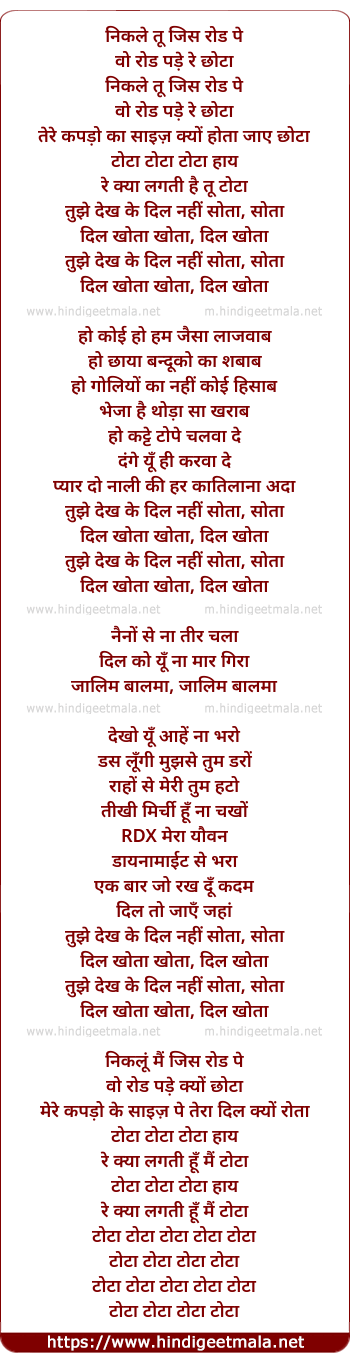 Lyrics of Totta, Tujhe Dekh Ke Dil Nahi Sota - निकले तू जिस रोड पे