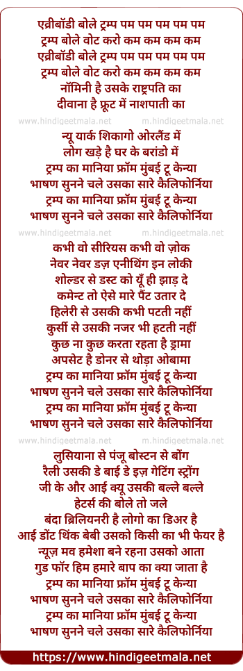 Lyrics of Trump Ka Mania - एव्रीबॉडी बोले ट्रम्प पम पम पम पम पम