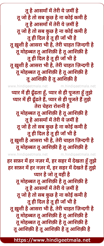 Lyrics of Tu Aashiqui Hai - तू आशिक़ी है