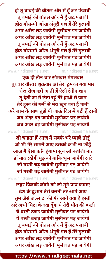 Lyrics of Tu Bombayi Ki Bottle Aur Mai Hu Jat Panjabi - तू बम्बई की बोतल और मैं हूँ जट पंजाबी