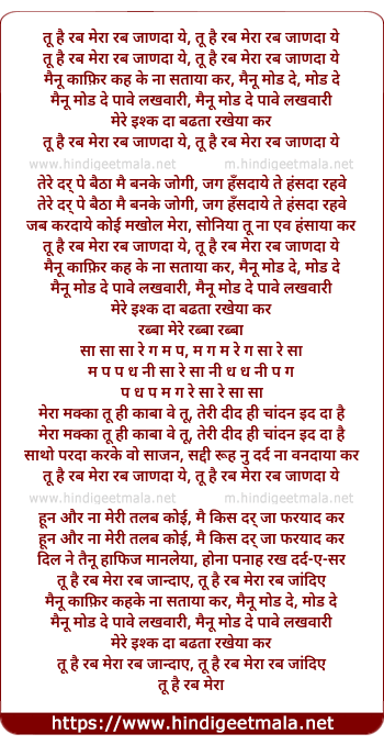 Lyrics of Tu Hai Rab Mera Rab Janda Ye - तू है रब मेरा रब जाणदा ये