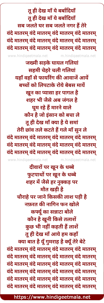 Lyrics of Tu Hi Dekh Maa Ye Barbadiya (Vande Mataram) - तू ही देख माँ ये बर्बादियाँ(वंदे मातरम् )