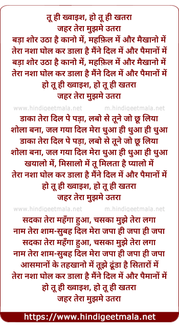 Lyrics of Tu Hi Khwahish, Ho Tu Hi Khatra - तू ही ख्वाईश, हो तू ही खतरा