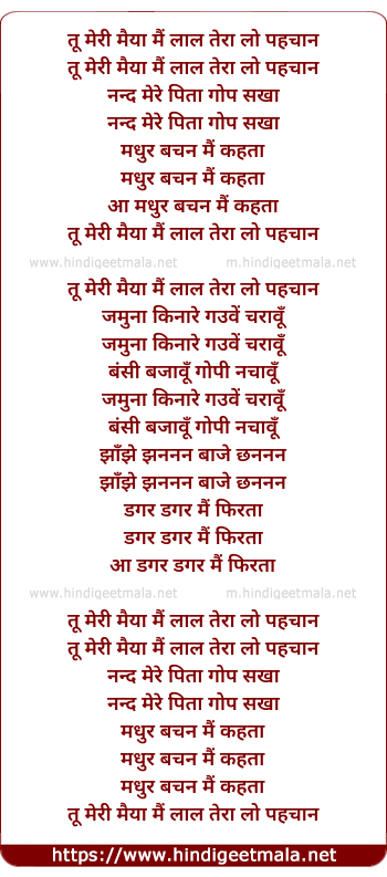 Lyrics of Tu Meri Maiyya Mai Laal Tera - तू मेरी मैया मैं लाल तेरा लो पहचान