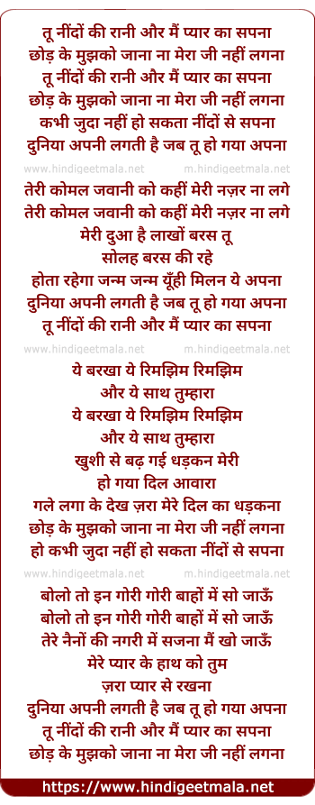 Lyrics of Tu Neendo Ki Rani Aur Mai Pyar Ka Sapna - तू नींदों की रानी और मैं प्यार का सपना