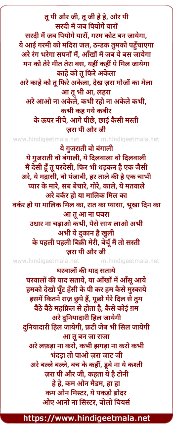 Lyrics of Tu Pi Aur Ji, Tu Ji He He, Aur Pi - तू पी और जी, तू जी हे हे, और पी