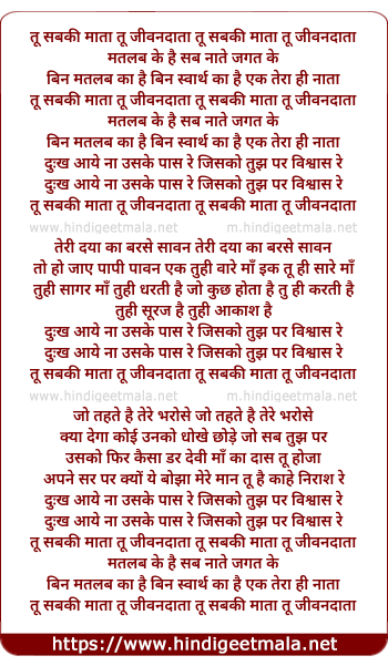Lyrics of Tu Sabki Maata Tu Jeevandata, Matlab Ke Hai Sab Natte Jagat Ke - तू सबकी माता तू जीवनदाता, मतलब के है सब नाते जगत के