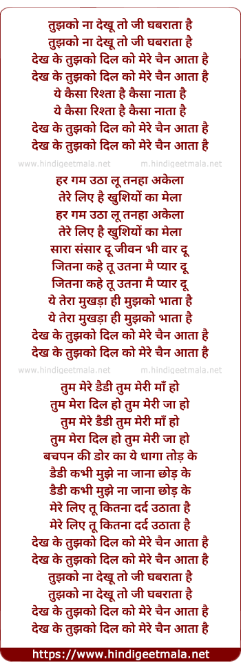 Lyrics of Tujhako Naa Dekhun, Dekhake Tujhako Dil Ko Mere Chain Aataa Hai - तुझको ना देखू ,देख के तुझको दिल को मेरे चैन आता है