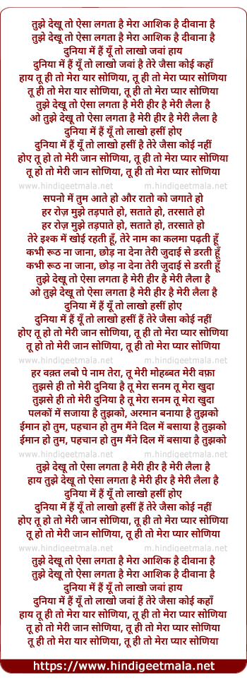 Lyrics of Tujhe Dekhu Toh Aisa Lagata Hai - तुझे देखू तो ऐसा लगता है