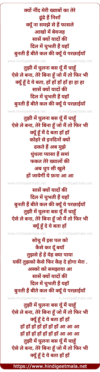 saasen kyu yaadon ki dil me chubhti hai yhan