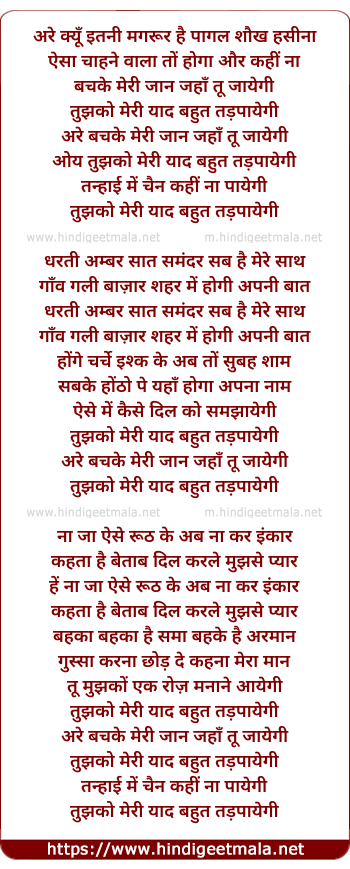 Lyrics of Tujko Meri Yaad Bahut Tadpaayegi - तुझको मेरी याद बहुत तड़पायेगी