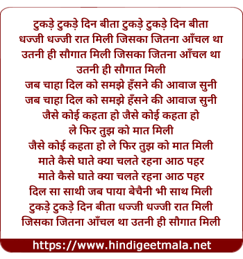 Lyrics of Tukde Tukde - टुकड़े टुकड़े दिन बीता टुकड़े टुकड़े दिन बीता