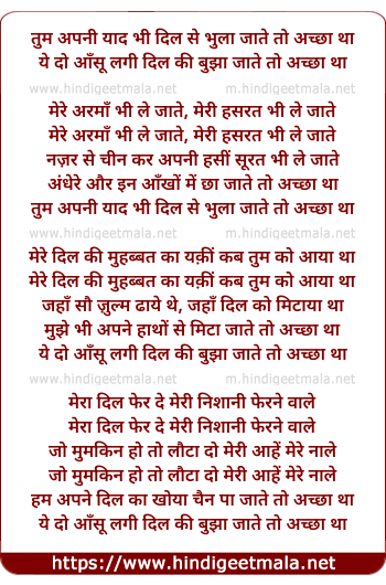 Lyrics of Tum Apni Yaad Bhi Dil Se Bhula Jaate To Achchha Tha - तुम अपनी याद भी दिल से भुला जाते तो अच्छा था