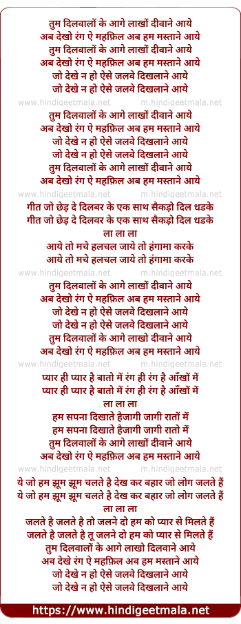 Lyrics of Tum Dil Walon Ke Aage Lakho Diwane - तुम दिलवालों के आगे लाखों दीवाने आये