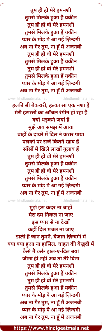 Lyrics of Tum Hi Ho Mere Hamnashee - तुम ही हो मेरे हमनशी