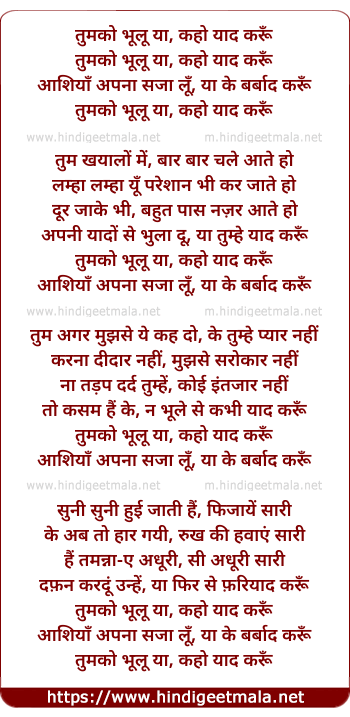 Lyrics of Tum Ko Bhoolu - तुमको भूलू या, कहो याद करूँ