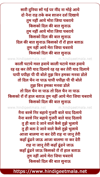 Lyrics of Tum Nahi Aaye Mora Jiya Ghabaray - तुम नहीं आये मोरा जिया घबराये