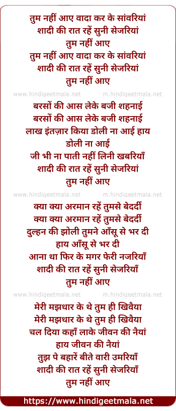 Lyrics of Tum Nahi Aaye Wada Kar Ke Sanwariyaa - तुम नहीं आए वादा कर के सांवरियां
