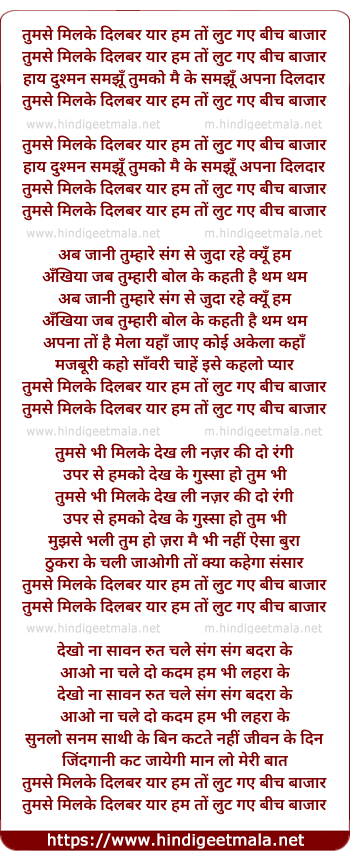 Lyrics of Tum Se Mil Ke Dilbar Yaar Hum To Lut Gaye Beech Bazar - तुमसे मिलके दिलबर यार हम तों लुट गए बीच बाजार