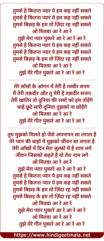 Lyrics of Tumase Hai Kitana Pyar O Mitava Tujhe Mera Pyar Pukare - तुमसे है कितना प्यार ओ मितवा तुझे मेरा प्यार पुकारे
