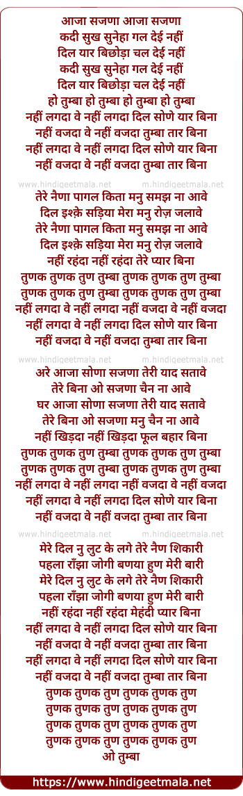 Lyrics of Tumba (Daler Mehndi) - आजा सजणा आजा सजणा