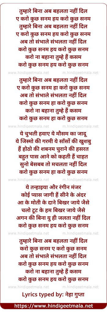 Lyrics of Tumhare Bina Ab Behlata Nahi Dil - तुम्हारे बिना अब बहलता नहीं दिल