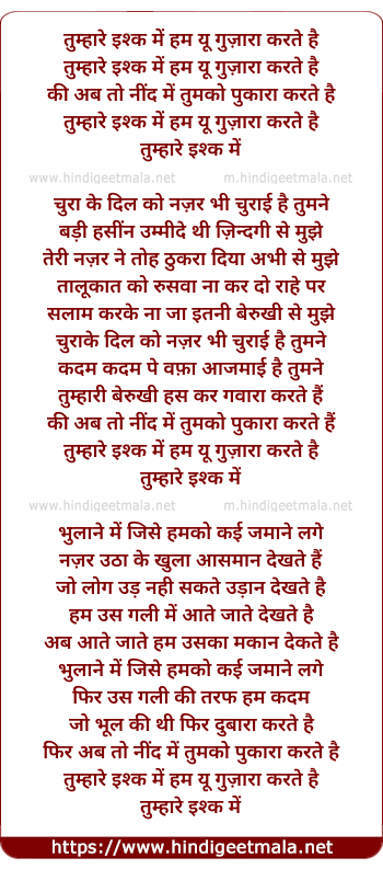 Lyrics of Tumhare Ishq Me - तुम्हारे इश्क में हम यू गुज़ारा करते है