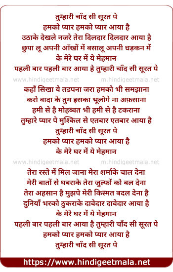 Lyrics of Tumhari Chand Si Surat Pe Hamko Pyar - तुम्हारी चाँद सी सूरत पे हमको प्यार