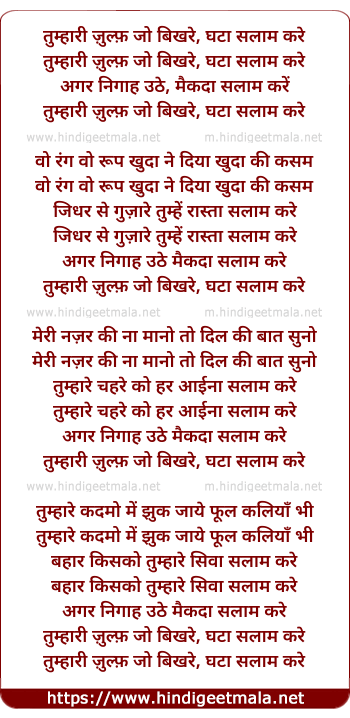 Lyrics of Tumhari Zulf Jo Bikhre - तुम्हारी ज़ुल्फ़ जो बिखरे, घटा सलाम करे