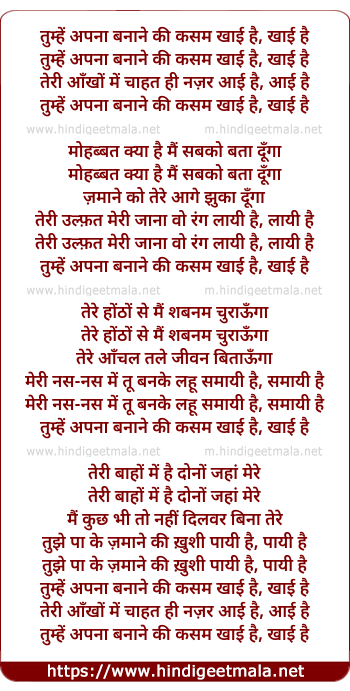 Lyrics of Tumhe Apna Banane Ki Kasam (Male) - तुम्हें अपना बनाने की कसम खाई है, खाई है
