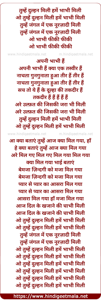 Lyrics of Tumhe Dulhan Mili Hame Bhaabhi Mili - तुम्हें दुल्हन मिली हमें भाभी मिली