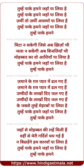 Lyrics of Tumhe Pake Hamne Jahan Pa Liya Hai - तुम्हें पाके हमने जहाँ पा लिया है