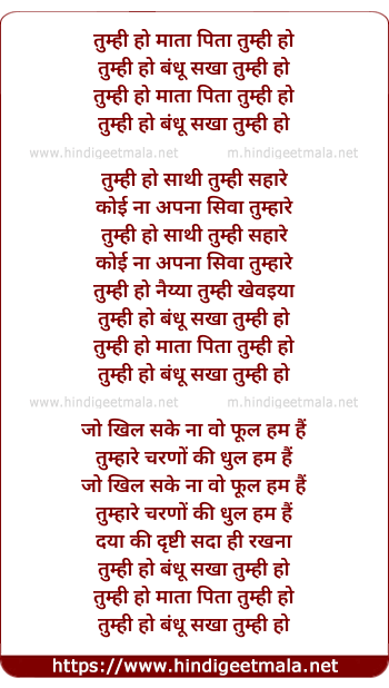 Lyrics of Tumhi Ho Mata Pita Tumhi Ho - तुम्ही हो माता पिता तुम्ही हो