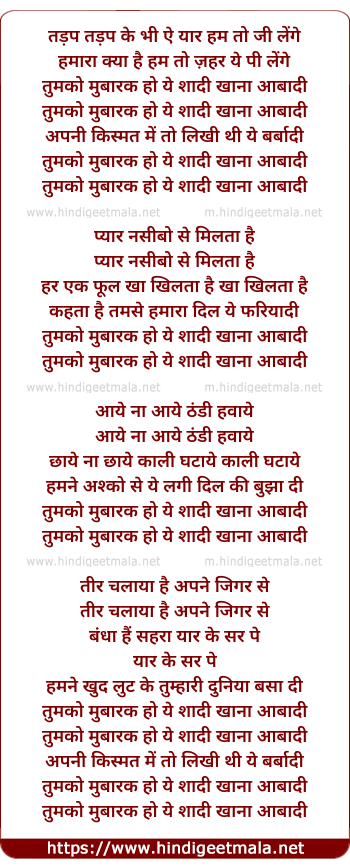 Lyrics of Tumko Mubarak Ho Ye Shadi Khana Aabadi - तुमको मुबारक हो ये शादी खाना आबादी