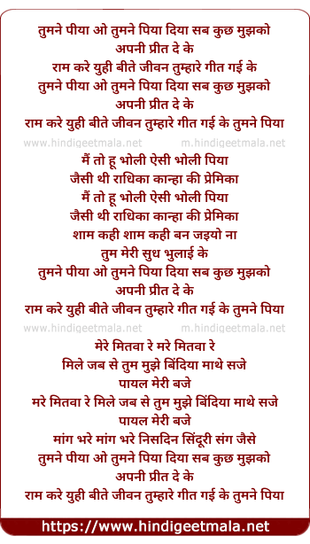 Lyrics of Tumne Piya Diya Sab Kuch Mujhko - तुमने पिया दिया सब कुछ मुझको