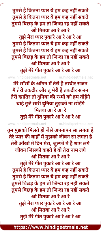 Lyrics of Tumse Hai Kitana Pyar Yeh Ham Kah Nahi Sakate - तुमसे है कितना प्यार ये हम कह नहीं सकते
