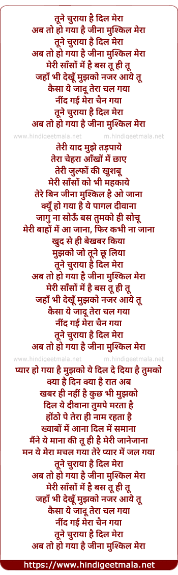 Lyrics of Tune Churaya - तूने चुराया है दिल मेरा