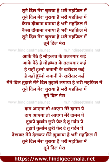 Lyrics of Tune Dil Meraa Churaya Hai Bhari Mehfil Me - तूने दिल मेरा चुराया है भरी महफ़िल में