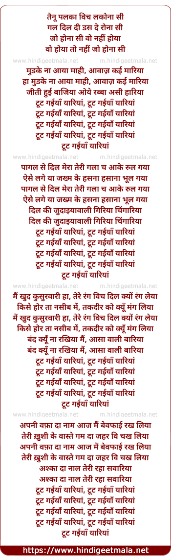 Lyrics of Tut Gayi Yariyan - टूट गईयाँ यारियां
