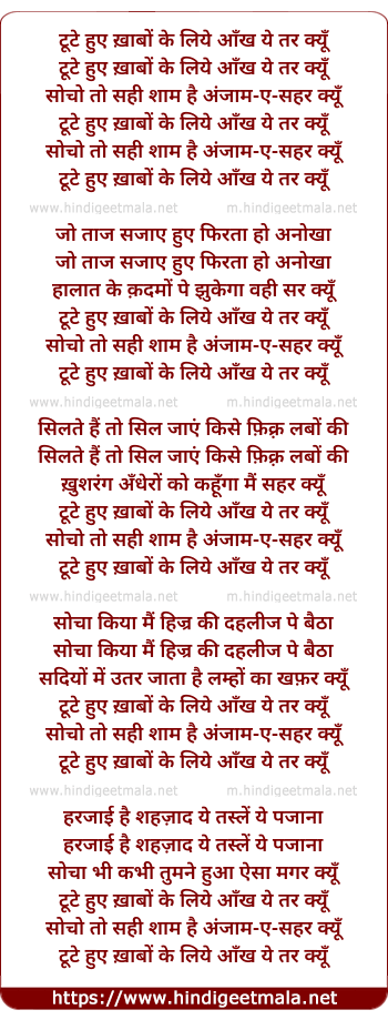 Lyrics of Tute Huye Khabo Ke Liye Aankh Yeh Tar Kyun - टूटे हुए ख़ाबों के लिये आँख ये तर क्यूँ