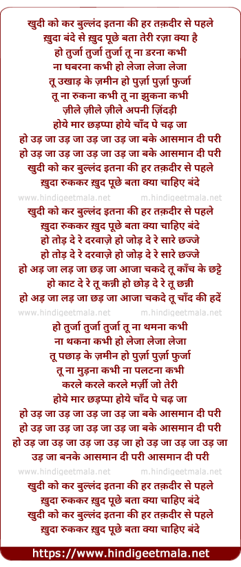 Lyrics of Udd Ja Banke Asmaan Di Pari - उड़ जा बनके आसमान दी परी