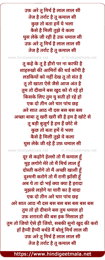 Lyrics of Uff Are Tu Mirch Hai Laal Laal Si - उफ़ अरे तू मिर्च है लाल लाल सी