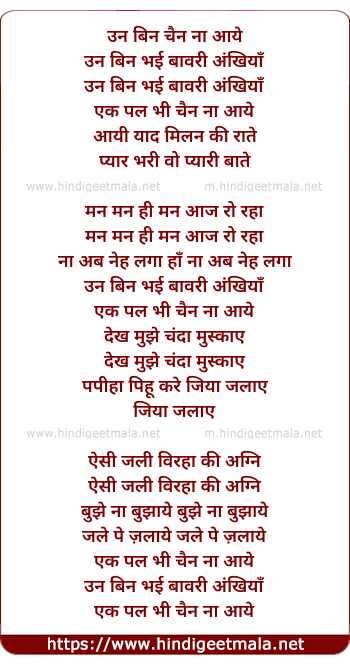 Lyrics of Un Bin Bhaye Bawri Ankhiya - उन बिन भई बावरी अंखियाँ