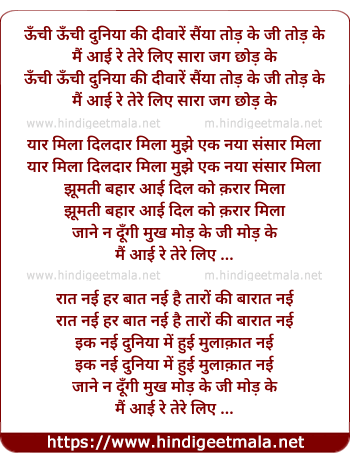 Lyrics of Uunchi Uunchi Duniyaa Ki Divaaren Sayyaan Tod Ke - ऊँची ऊँची दुनिया की दीवारें सैंया तोड़ के
