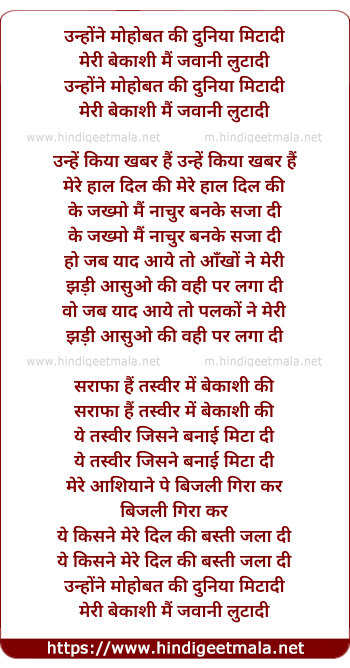 Lyrics of Unhone Mohabbat Ki Duniya Mita Di - उन्होंने मोहोबत की दुनिया मिटादी