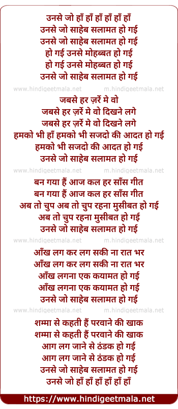 Lyrics of Unse Jo Sahab Salamat Ho Gayi - उनसे जो हाँ हाँ हाँ हाँ हाँ हाँ