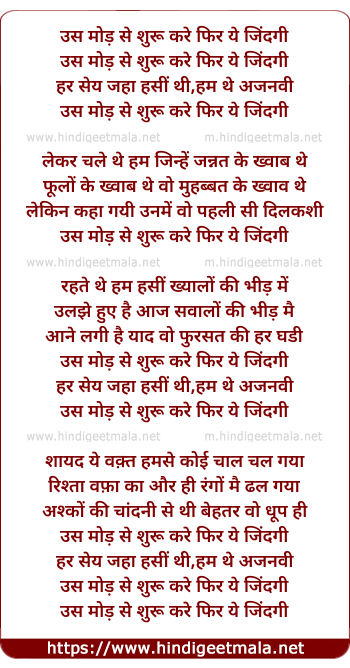 Lyrics of Us Mod Se Shuru Kare Phir Yeh Zindagi - उस मोड़ से शुरू करे फिर ये जिंदगी