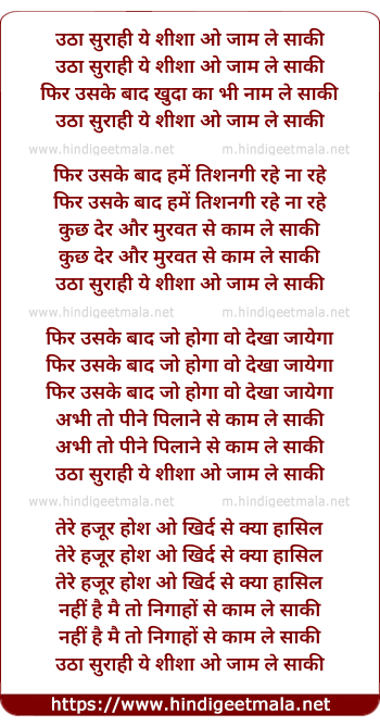 Lyrics of Utha Surahi Ye Shisha-O-Jaam Le Saki - उठा सुराही ये शीशा ओ जाम ले साकी