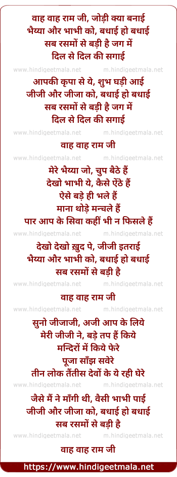 Lyrics of Vaah Vaah Raam Ji Jodi Kyaa Banaai - वाह वाह राम जी जोड़ी क्या बनाई