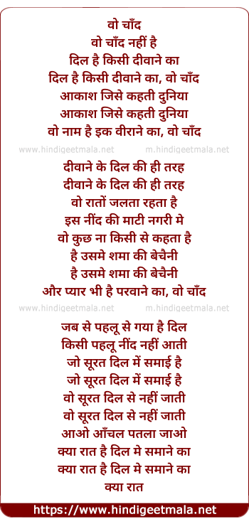 Lyrics of Vo Chaand Nahin Hai Dil Hai Kisi Divaane Kaa - वो चाँद नहीं है दिल है किसी दीवाने का